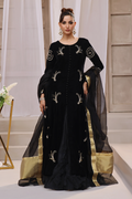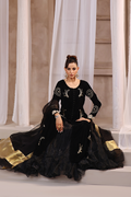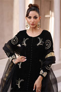 Indulge in luxurious sophistication with farya a captivating ensemble that exudes timeless charm. Crafted from sumptuous panelled French velvet, this attire features intricate hand zardizi work of pearls and kora dapka work on all oavr front a regal touch to the design. Paired with crush dhaka pants adorned with delicate ruffles , " offers a perfect blend of tradition and contemporary style. Complete the look with the pure organza dupatta, embellished with a graceful sequence spray and finished with maisori jamawar detailing.