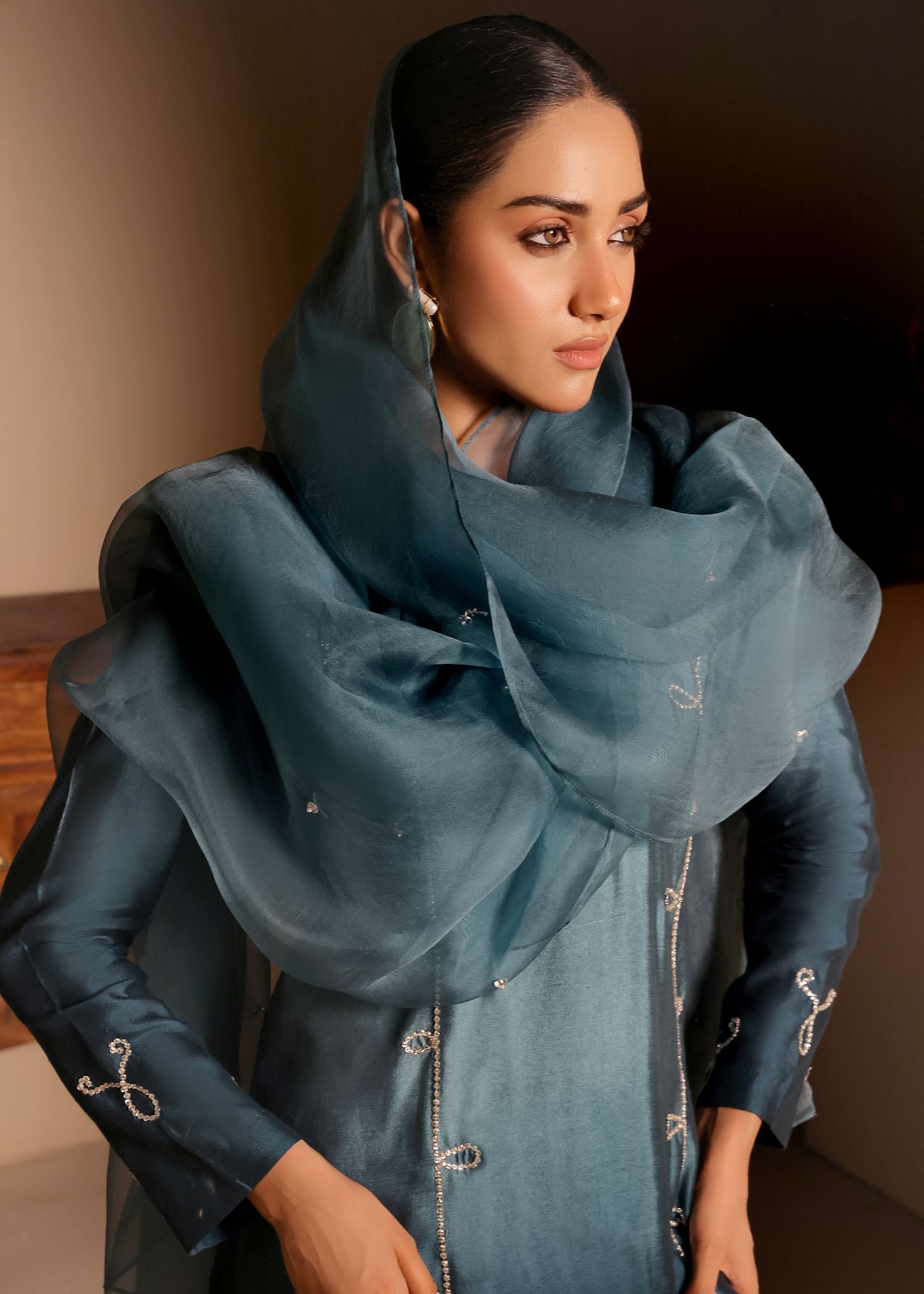 Introducing Mona Imran's elegant long-length panelled shirt ensemble, a sophisticated choice for any occasion. This stunning shirt features intricate applique work on the neckline, beautifully enhanced with delicate stone embellishments on the neck and panels, adding a touch of glamour and refinement.