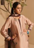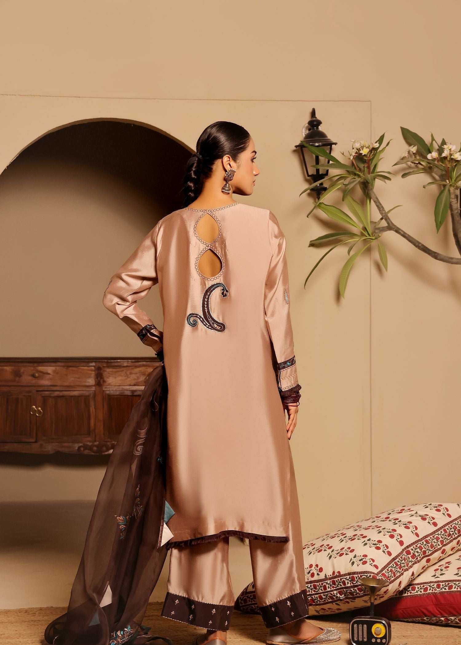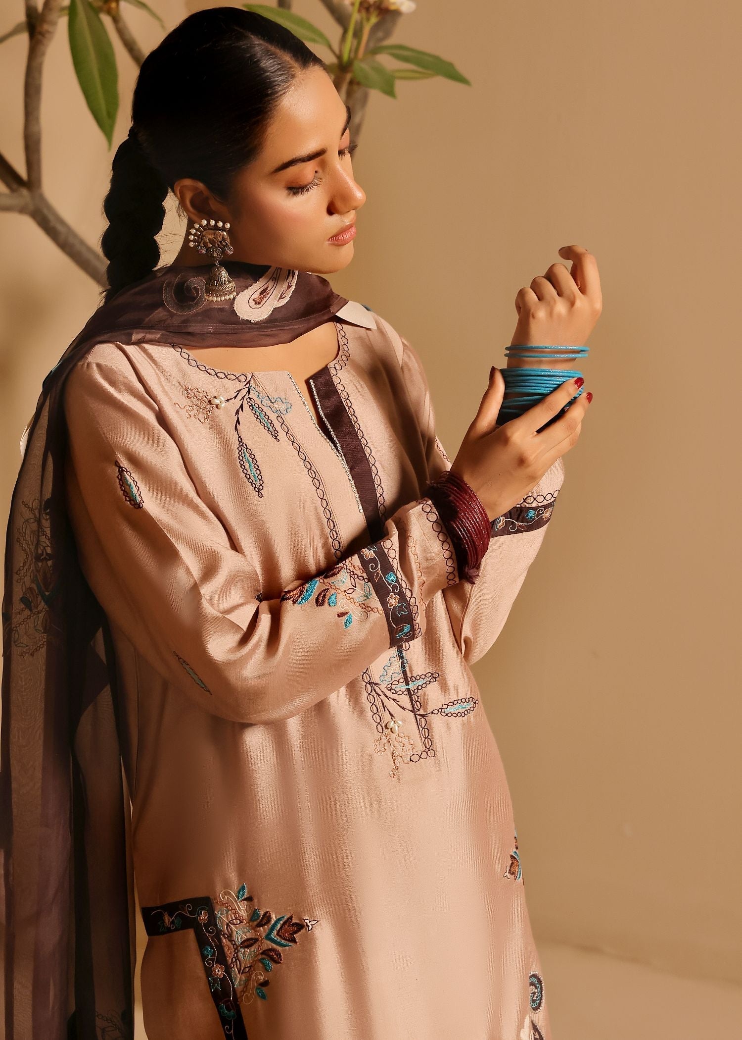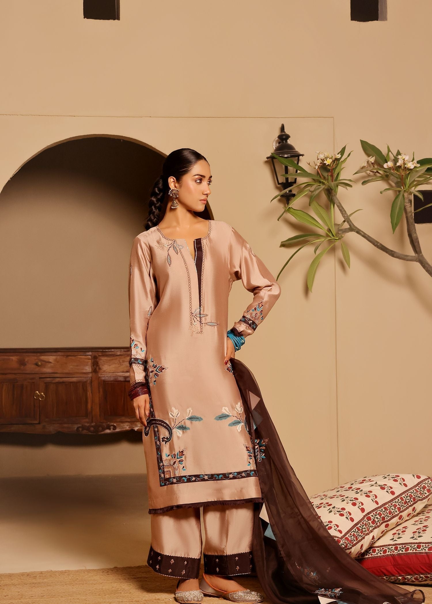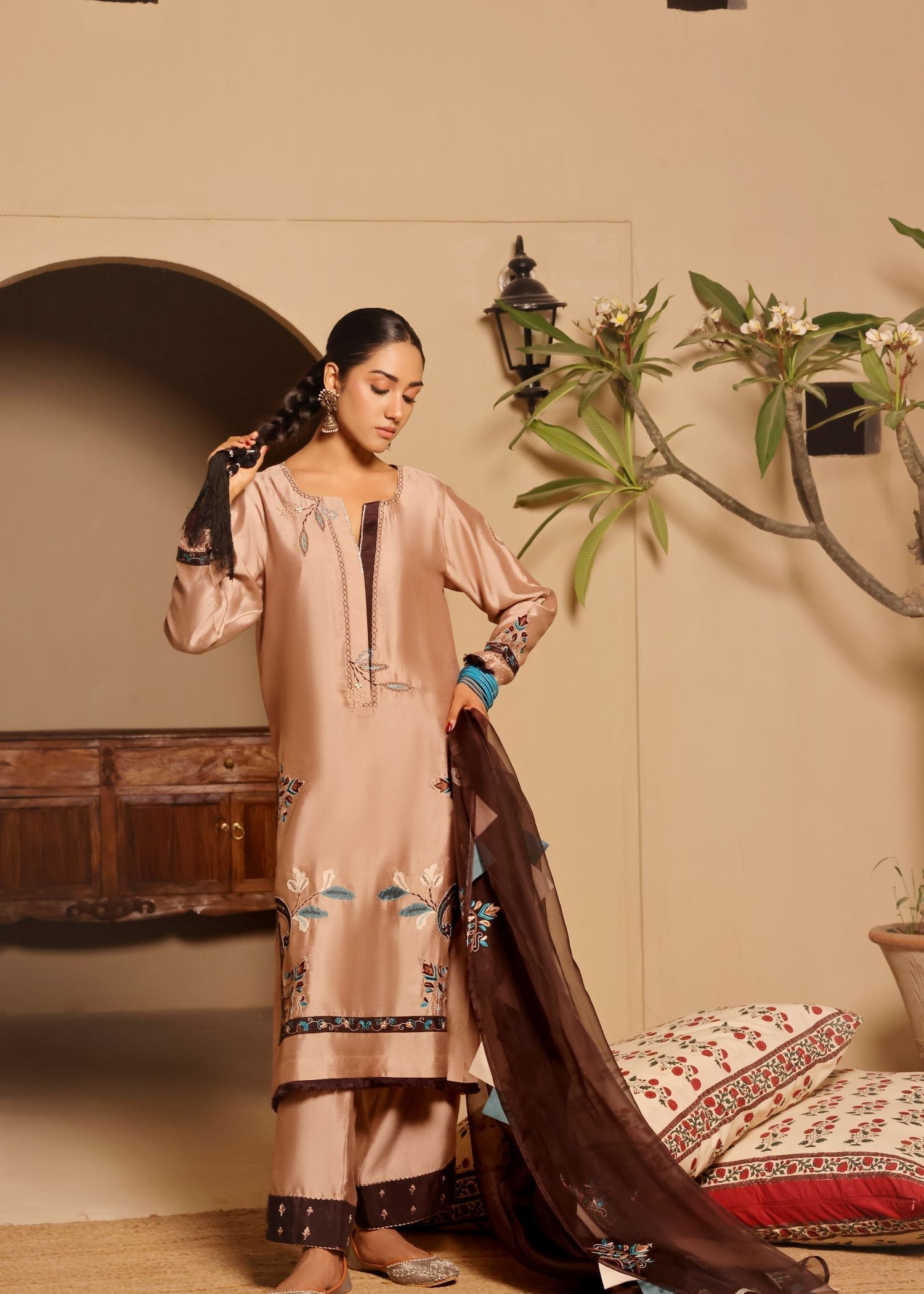 Paired with an intricately embroidered ezar, this ensemble ensures both style and comfort. The highlight is the pure chocolate brown organza dupatta, adorned with elaborate applique and resham work, adding a touch of luxurious refinement.