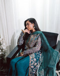 This teal blue three-piece set, which has a gorgeous organza and raw silk combination, exudes regal beauty. Exquisite accents on the long organza shirt with delicate embroidery add to the opulent attractiveness of the ensemble. This pattern provides the ideal balance of texture and style when paired with crushed raw silk pants. A matching dupatta completes the set, giving it an airy feel. This dress, perfect for Eid celebrations or formal parties, is a masterpiece of ageless sophistication.