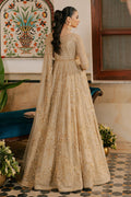 This champagne gold maxi frock is an elite choice this wedding season. With its boat neckline & sheer organza applique details underneath to balance the bodice, the frock is heavily hand embellished with stone work, pearls, crystal work & heavy sitari details along with thread embroidery and sequin work the embellished three-quarter sleeves with scalloped hem are jointed with handmade crystal tassels. The back of the bodice is adorned with hand embellishments spray & statement keyhole details. The maxi frock itself is heavily bejeweled with heavy pearl work along with malicious motifs and shiny motifs with textured patterns, finished with embroidered border & minimal lace. The dupatta is adorned with hand adda embellishments along with scalloped sides length wise finished with pallu side textured embroidered borders. Outfit comes with a matching hand embellished clutch & straight pants.
