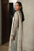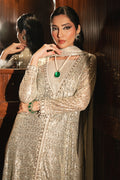 Stunning net gown featuring a deep V-shaped stylized neckline adorned with luxurious adda work straps. The neckline includes an inner fabric with separate sequin pattern for added dimension. The distinctive V-neckline transitions into an elegant slit edged with adda work that extends gracefully to the hem. Fitted sleeves showcase intricate embroidery, sequins, and adda work along the hem with sophisticated hanging details, while sequins adorn the entire sleeve. The net fabric glimmers with meticulous embroidery, sequins, and adda work throughout. Complemented by straight trousers in premium PK raw silk and a flowing net dupatta featuring 2-side border with spray motif, refined 4-side facing, and all-head repeat embroidery and sequins for celestial elegance.