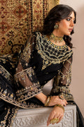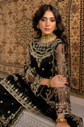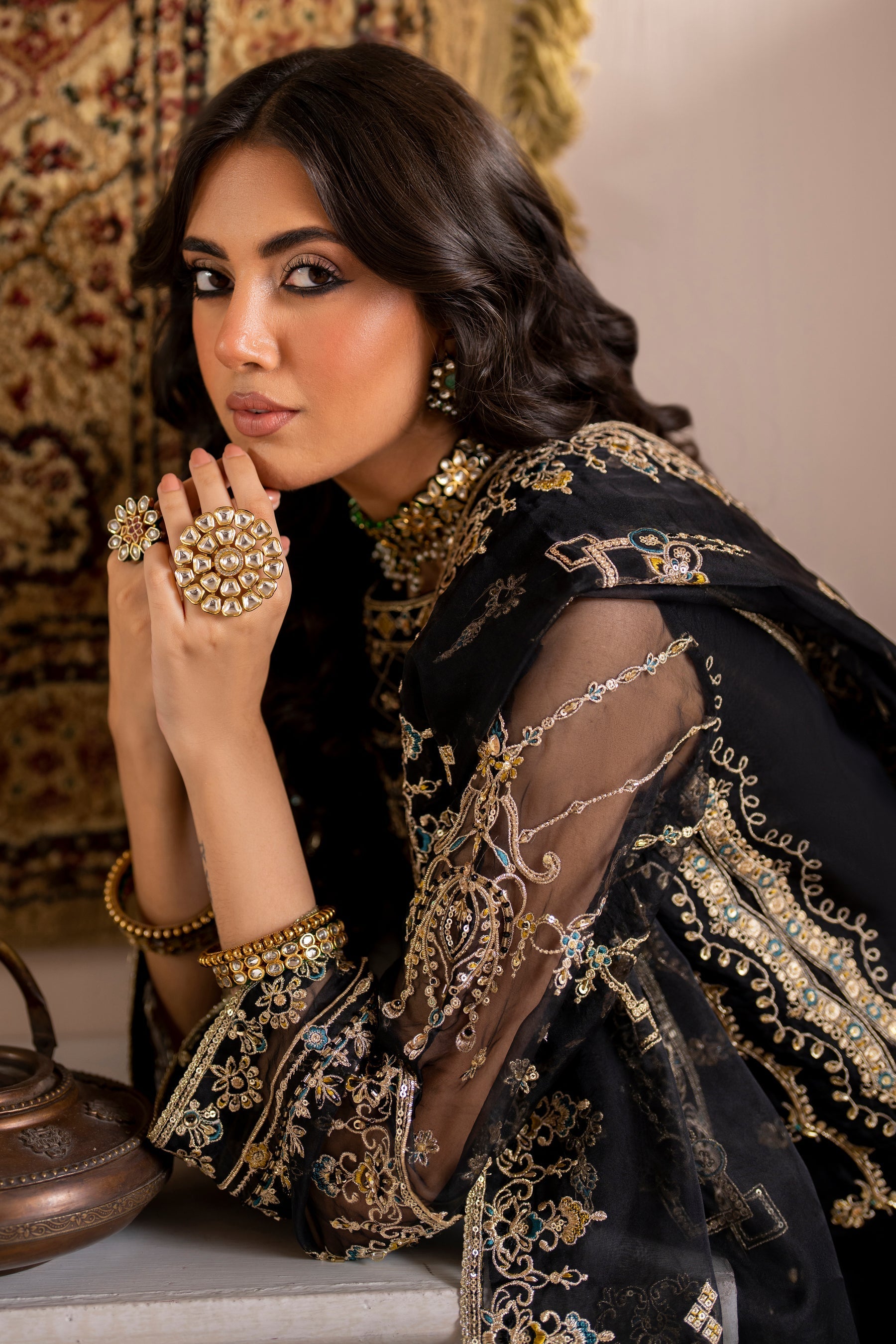 This classic black ensemble has a stylized neckline with side keyholes & stylized embellished motif patterns with embroidery details. The shirt front is delighted with pure adda embellished motif spread. The real showstopper is the contrasting scalloped side seams & border with embellished patterns along with embroidery & sequin work bejeweling both front & back.  The loose fitted sleeves are adorned with contrasting floral embroidery patterns along with sequin work & lace. Leenass dupatta is adorned with length wise 2-sided embroidery border, mid motif spread & lace finishing. Outfit is paired with plain straight pants.
