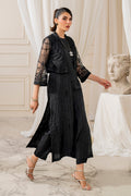 This lustrous black hued ensemble has PK Raw silk shirt adorned with same as base line pattern embroidery & sequin work on front & back. Topped with a hand embellished cropped jacket with geometrical pattern on the front, back & three-quarter sleeves, bejeweled with crystals, bead work, handmade hangings& glamorous sleeve borders. Topped with embroidered dupatta with sequin details, finished with beaded lace, Siara is paired with straight pants.