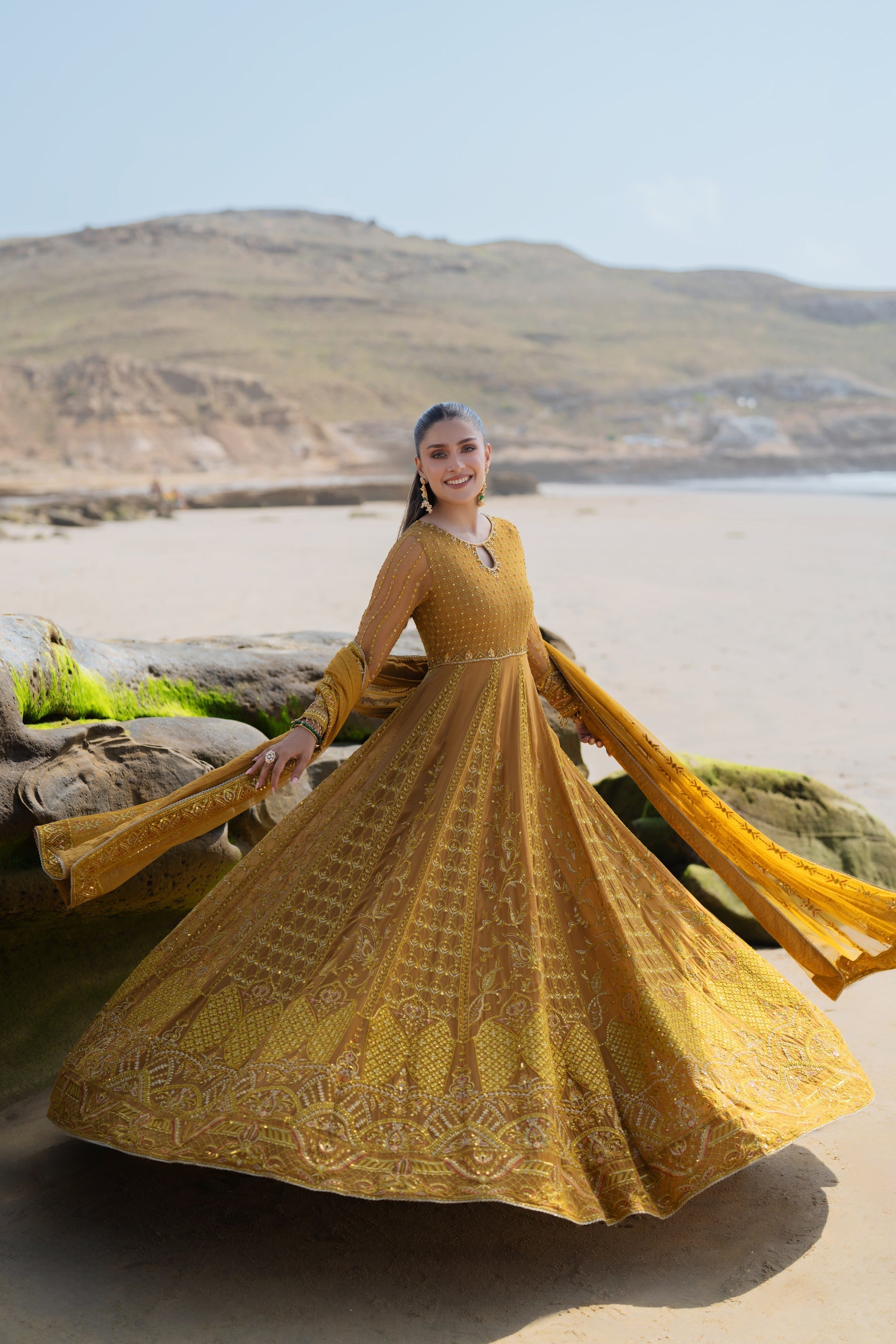 Ainara is adorned with a round neckline and a keyhole element. The bodice & sleeves are heavily adorned with hand adda embellishments, embroidery, sequin play, stone & sitari work, and handmade dangling hangings. The back is adorned with heavy handmade tassels. Each panel of the frock is ornamented with embroidery & sequin work & the panels are maliciously adorned with alternate design techniques where every alter panel is adorned with signature floral motifs & geometrical patterns with floral details along with monochrome tones of mustard & yellow & minor touches of contrasting hues. The outfit is finished with embroidered chunky borders & minimal lace. The dupatta is adorned with floral & line patterns all over & finely finished with a 4-sided embroidered border with contrasting hues of orange. Outfit comes with plain straight pants. Â