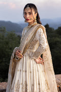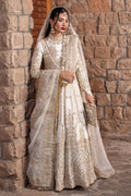 A delicate dove white floor length frock with halter neckline and deep back, Fasana is oness dream nikkah look. The neckline comprises of composed motification along with extended sleeves & voluminous panels. The frock is heavily bejeweled with hand adda embellishments including including kora, dabka, crystals, sitari, cutdana, tilla, payal, naqshi & heavy embellishment techniques, embroidery & mirror work on the front & back along with line work & embellished + embroidered heavy jaal border with heavy mirror work. It is topped with hand adda embellishments, embroidery, motif spread, heavy four-sided pallu, tissue facing & every bridess dream kiran lace finishing. Outfit is adorned with handmade embellished pouch along with straight pants.Â