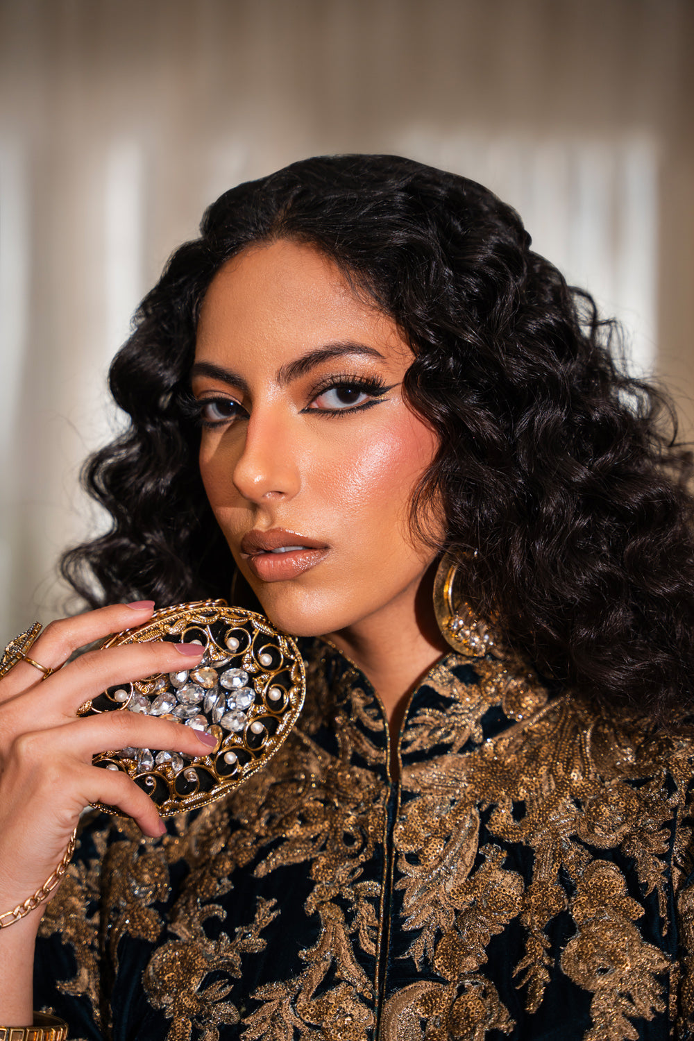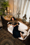 The €œAfsana€� is an opulent pure velvet kaftan that seamlessly blends timeless elegance with rich cultural heritage. Crafted from the finest velvet, the fabric offers a soft, sumptuous feel, draping effortlessly to create a silhouette that exudes sophistication. The kaftan is adorned with exquisite Persian-inspired embroidery, showcasing intricate floral and geometric patterns that speak to a legacy of craftsmanship. The embroidery, done in rich, contrasting threads, adds depth and texture, creating a stunning visual contrast against the velvet fabric.