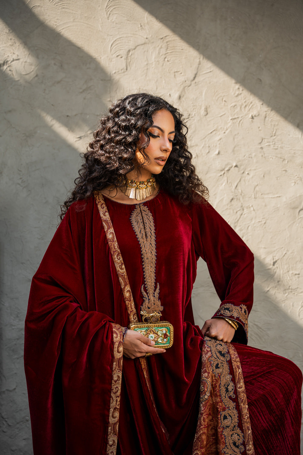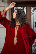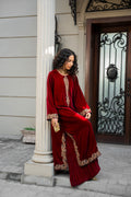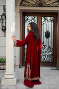 A pure velvet shawl completes the ensemble, showcasing exquisite Persian embroidery and Kimkhaab details that further elevate the look with its rich, handwoven artistry.