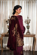 An enchanting ensemble that blends timeless elegance with a touch of regal charm. This exquisite matching set is crafted from deep burgundy velvet, featuring a stunning side slit cape jacket with intricate carvings and ornate embroidery, hand-embellished using our signature techniques. The jacket showcases an ancient royal pattern, embodying timeless sophistication. Paired with a luxurious silk inner top, adorned with delicate gathers at the waist, and high slit pants, this set exudes both grace and strength.