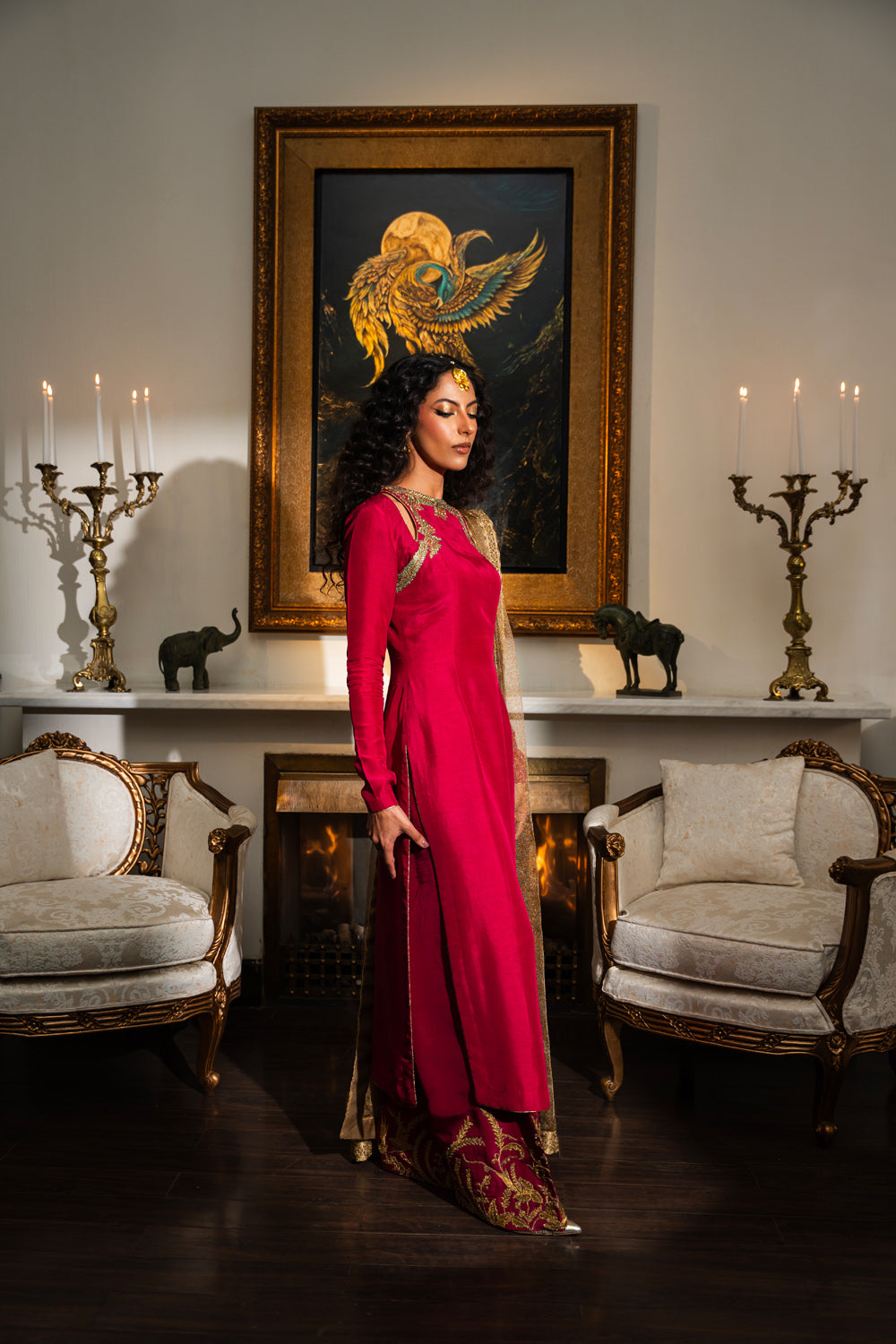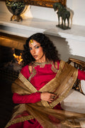 €œUlfat€� is an exquisite 3-piece ensemble that beautifully blends rich heritage with modern elegance. The shirt, crafted from luxurious pure Korean raw silk, is enhanced with intricate heritage embroidery and subtle fabric manipulation at the neckline, creating a refined and graceful silhouette. The antique gold embroidery on the shalwar adds a touch of opulence, bringing timeless craftsmanship to the ensemble.