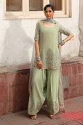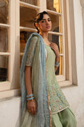 IntroducingAdeena,� a shalwar kameez set crafted from luxurious Khadi net fabric. The mint green base is embellished with captivating silk and tilla embroidery. The shirt features a stunning neckline adorned with metallic gota lace, perfectly complementing the intricate embroidery and delicate bead and gota kinari accents. Embroidered borders on the sleeves and accented trims further enhance the ensembless elegance. The matching raw silk pants are detailed with embroidered borders along the hem, while the dupatta, featuring rich stripes and gota kinari on all four sides, echoes the mint green and blue hues. This set is ideal for women celebrating festive seasons with grace and sophistication.