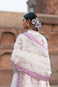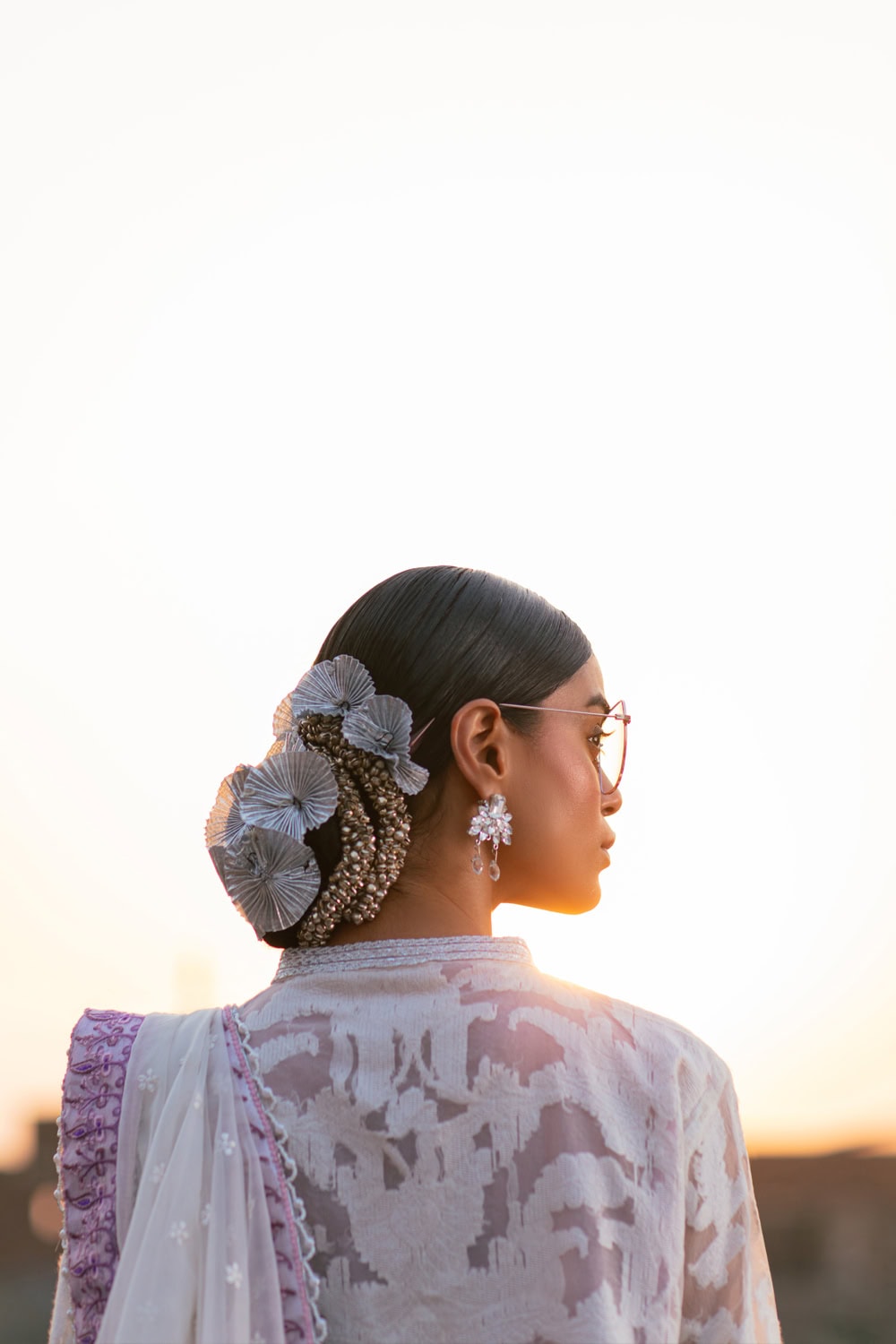 Immerse yourself in the captivating allure ofADIRA,� a stunning ensemble exuding timeless elegance. The immaculate white self-organza shirt, adorned with silk thread embroidery, silver lappa, and gota braids, stands as a true masterpiece of artistry, enhanced by pearl and diamante accents. This ensemble epitomises heritage and sophistication. The celestial organza dupatta, featuring silk thread embroidery, silver lappa, and a delicately embroidered border, adds a celestial touch to the attire. Complementing the ensemble is a pure raw silk tulip shalwar, embellished with embroidered scallops.Adira� seamlessly combines tradition with modern allure, appealing to all generations.