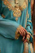 IntroducingAria,� a refined ensemble that redefines elegance. The georgette chiffon Chogha-styled Kurta, in a vibrant shade of blue, is adorned with exquisite gold gota ashrafi flowers, gota pati, and matt sitara, presenting a masterpiece of artistry tailored for the modern generation with a penchant for tradition. The ethereal crinkle chiffon dupatta features intricate matt sitara motifs and decorative trims, adding an enchanting touch to the ensemble. Complementing this is a printed sharrara enhanced with delicate gota embroidered borders, completing the look with a fusion of sophistication and heritage.