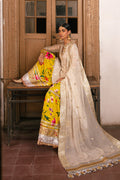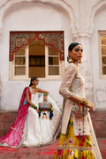 Azara� presents our traditional off-white shirt and gharara ensemble. The chikankari kameez boasts intricate silk thread embroidery, adorned with embellishments such as panni tilla and gota ashrafis. The sleeves are adorned with elaborate panni tilla embroidery. Complementing the ensemble is a digitally printed charmeuse silk gharara, featuring thick borders of gota and lappa. Paired with a matching off-white chiffon dupatta, adorned with panni tilla borders on all four sides and motifs scattered across the fabric. This illuminated ensemble is a classic silhouette meticulously draped to create an enchanting look.