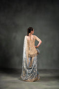 Gold chiffon richly embroidered shirt emballished with jewel pieces shaded blue gold/silver dupatta with embroidery enhances the elegance of outfit.