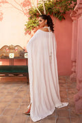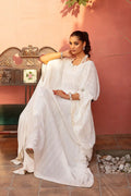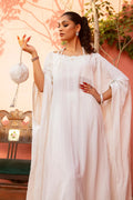 This exquisitely designed white-on-white linear chiffon embroidered kaftan is truly a head-turner. with an intricately designed neckline creating a supremely flattering silhouette. further embellished with jewel motifs and tassel. Stylized with tube top with heavily embellished chiffon knotted braided strap along with crystals and pearl tassels detail paired with tapered pants. A timeless NS style that never fails to impress!