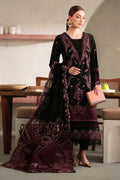 Embroidered Karandi Shirt, Embroidered Chiffon Dupatta With Embroidered Organza Palu And 4 Side Embroidered Border And Dyed Karandi Trouser