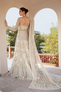 Candelia, a breathtaking ode to elegance in pristine white. This stunning ensemble boasts captivating craftsmanship, where every detail is a testament to perfection. Composed of the finest organza, the dress features a mesmerizing net dupatta and shirt adorned with blue and golden-hued intricate work, revealing the masterful touch of dabka, gotta, crystals, pearls, and cutdana. Paired with luxurious raw silk trousers, Candelia is ready to illuminate any occasion with its ravishing style.