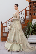 Raya is a true work of sartorial art. This glamorous dress, in pure golden, is adorned with intricate mastery that will leave you spellbound. A subtle touch of azure detailing adds a mesmerizing appeal to its beauty. The organza dupatta boasts heavily embellished borders, while the shirt's fine organza fabric exudes a delicate charm. The raw silk lehenga adds a touch of regal grace to complete the ensemble. Dabka, gotta, crystals, pearls, and cutdana are intricately woven into every thread, destined to make you the star of any occasion.