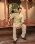 Description: Fusing vintage opulence with modern-day glamour, Zaared is true sartorial refinement. Crafted on luxurious off-white boski fabric, the kurta and shalwar set are perfectly complemented with a pistachio karandi waistcoat lavishly embroidered with heritage resham work stitches, making it the ultimate choice for the modern man.