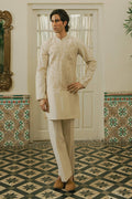 This short karandi kurta in Morning Sand features a large floral and leafy motif embroidered across the chest in tonal thread, anchor, Resham, and machine embroidery. The band collar neckline and sleeve borders are accented with loop buttons and delicate embroidery, adding structure to the soft, flowing silhouette. A perfect choice for Eid mornings spent in family gatherings, moving effortlessly from prayers to festive meals.