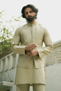 A short cotton kurta, trousers, and waistcoat set featuring repeats of ambi paisley motifs embroidered on the waistcoat in tone-on-tone anchor and Resham work. The kurtass neckline and sleeve borders are detailed with ari embroidery, adding a subtle contrast. Ideal for celebrating Eid with loved ones, from the quiet reverence of the mosque to the warmth of the dining table.