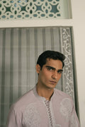 This short cotton kurta and loose trousers in Lilac Smoke are adorned with large, henna-inspired paisley motifs embroidered in lighter shades of anchor and Resham. The bordered neckline and sleeves add definition to the soft, flowing silhouette. Thoughtfully designed for Eid afternoons, when conversation lingers over endless cups of chai and laughter echoes through sunlit rooms.