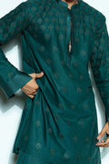 green cotton embroidered box cut Qamix with embroided tareez ,straight cut cuffed sleeves with a slit finished with pure satin finish for hidden placket , band collar & cuff .
