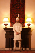 A rich white color self-silk jamawar sherwani paired with same fabric pants, beautifully finished with zardozi motifs spray on all over the sherwani.
