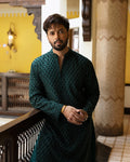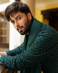 Embodying artistic flair, Taavi is an ode to luxury. Crafted on emerald green Karandi, the elongated shirt dazzles with moti and cutdana adornments. Paired with an embellished self jamawar shawl and pure raw silk shalwar, this ensemble will ensure you stand out at your special events.