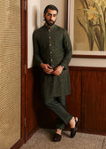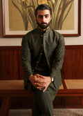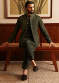 An Olive Embrodiered matching set. Waistcoat is lifted with special Meena worked buttons curated for HAZURE. Also available with solid gold matte or shiny buttons as per clients preference.