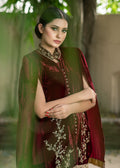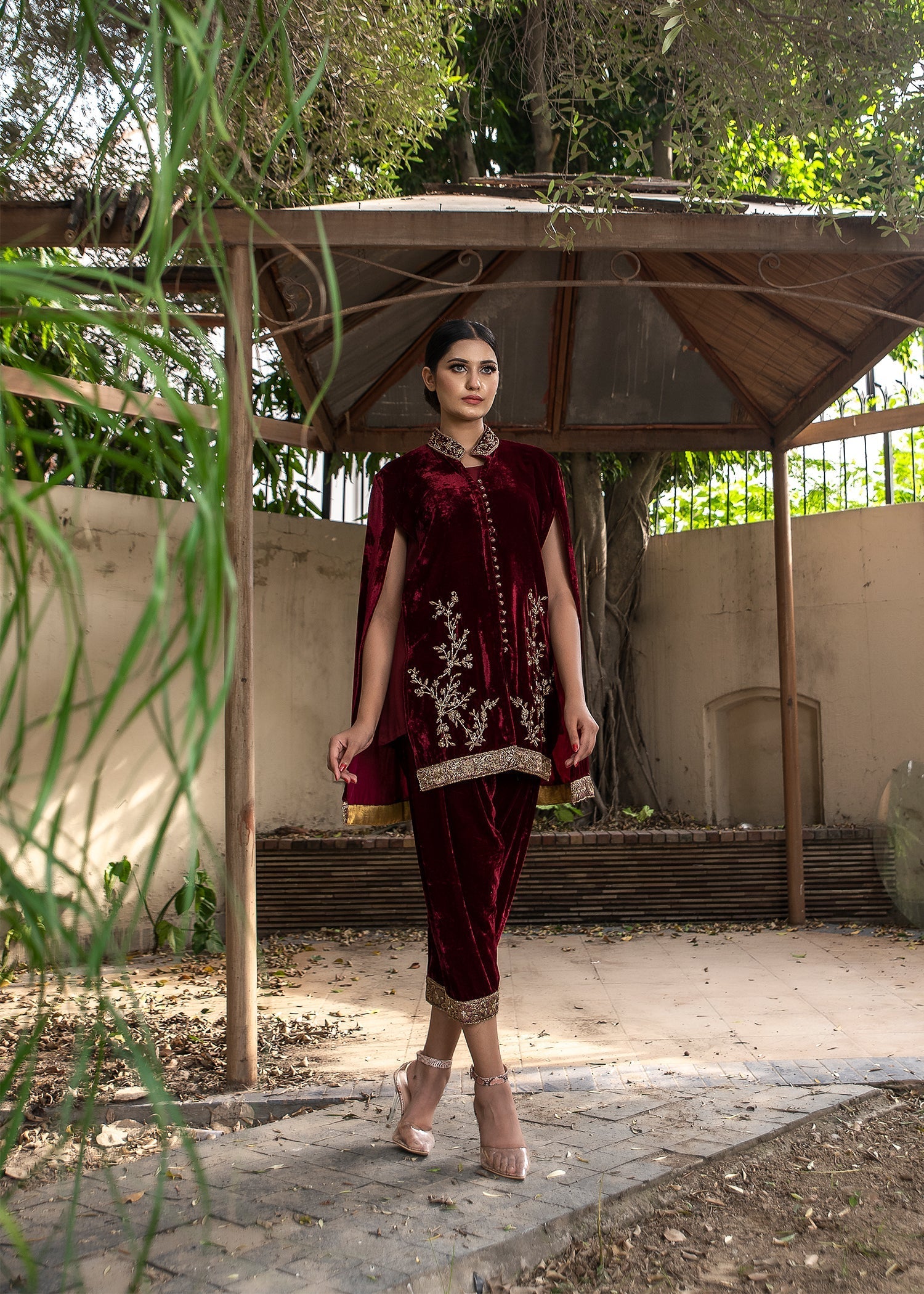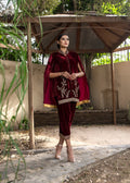 Maroon Velvet cape all handworked with tilla, dabka, and zardozi with jamawar accents. Silk inner shirt matching velvet skinny shalwar with the same work on the bottom