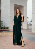 Deep forest green Velvet Kaftan delicately handworked with dabka, nakshi and zardozi on the neckline, shoulder slits, sleeves and front and back hemline and side slits.