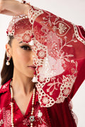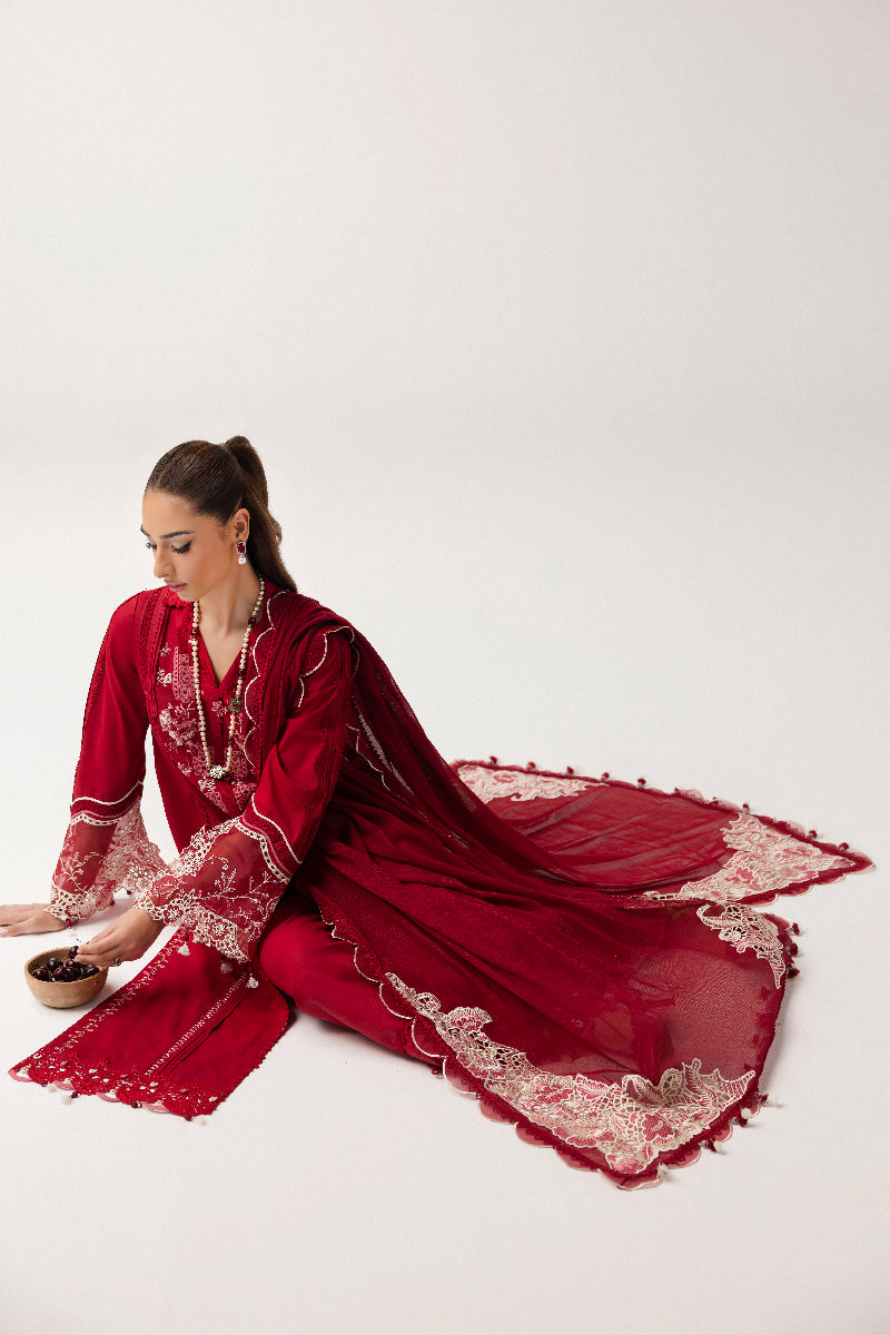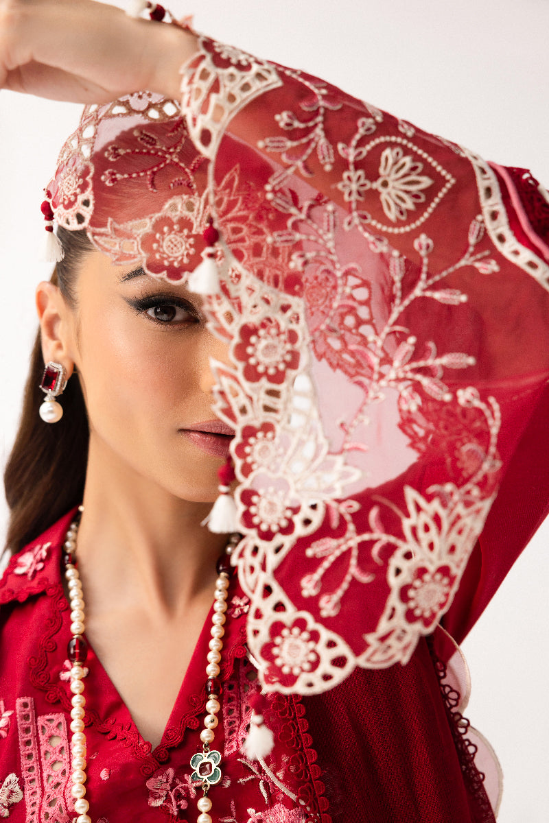 Introducing a vibrant fresh red ensemble, beautifully adorned with white embroidery and lace details. Paired with a soft cotton net dupatta and plain trousers.