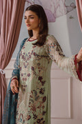 Embroidered Chiffon front with sequins Embroidered Chiffon back Embroidered Chiffon sleeves Embroidered organza sleeves lace Embroidered organza ghera lace Embroidered net dupatta - 2.50 Meter Raw silk trouser - 2.5 Meter Embroidered organza trouser lace.