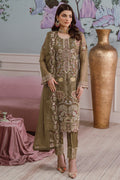 Embroidered Chiffon front with sequins Embroidered Chiffon back Embroidered Chiffon sleeves Embroidered organza sleeves lace Embroidered organza ghera lace Embroidered chiffon dupatta - 2.50 Meter Raw silk trouser - 2.5 Meter Embroidered organza trouser lace.