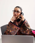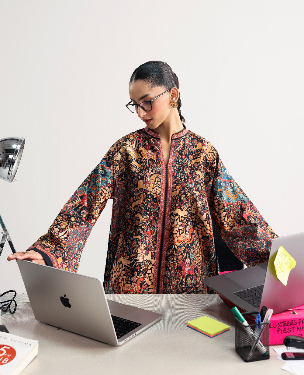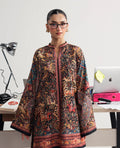 This design takes a cue from handwoven textile carpet with rich earthy tones, vines and motifs arranged in bold framed kurta with full sleeves paired with straight trouser, feels artistic and culturally stylish.