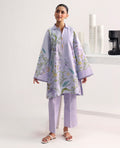The serene beauty of dreamy lilac floral shirt kurta with wide sleeves features a sophisticated composition of finely rendered florals, complemented by graceful birds with ikat spot pants set against a muted lavender backdrop to convey harmony, serenity, and refined natural beauty.