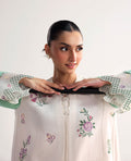 A chic design featuring contrasted lily-green sleeves with a color-blocked white border, beautifully highlighted with pastel embroidery in soft shades of yellow and lilac. A perfect fusion of elegance and subtle playfulness, making it an ideal pick for modern everyday wear.