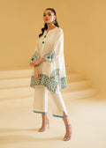 Block printed drop shoulder Korean rawsilk shirt with rounded neckline adorned with pompoms on the sleeves and pleated patti in the center. Paired with rawsilk pants adorned with side slit and block printed border.