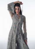 A floor length net jacket composed in a brickwork of beautiful motifs composed in a mix of floral and abstract patterns. Detailed by hand with soft steel blue petals and a generous dose of crystals, pearls and silver work.