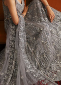 A Smokey grey net formal long shirt with a crushed tissue sharara. The shirt is finely embellished by hand and paired with a heavy net dupatta to match. Paired with a voluminous crushed silver grey sharara .