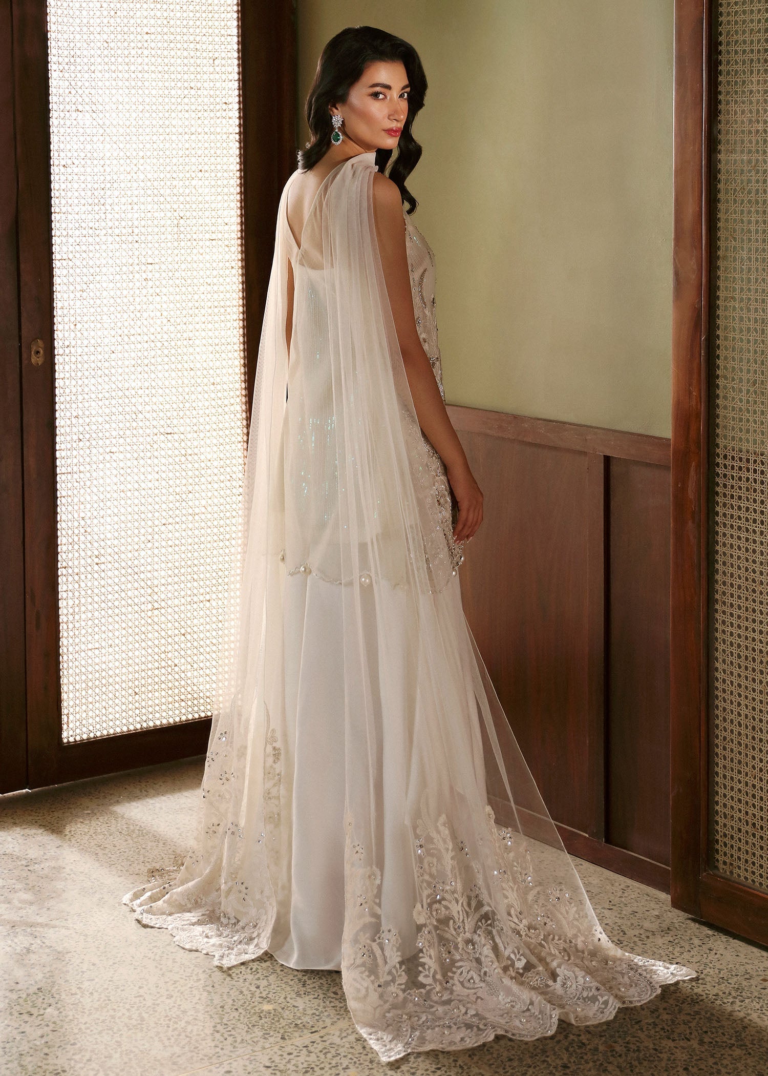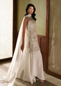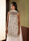 Short white tunic shirt with a gorgeous hand worked silver neckline complimenting hand lifted French lace patterns. Paired with a flowy silk voluminous draped pant and a net stole featuring French lace motifs.