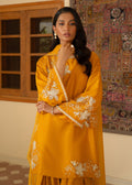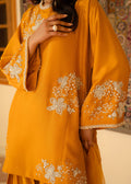 Silk based matching set in honey mustard color shows off scattered asymmetric floral motifs detailed entirely by hand in a mix or silver and pearl adornments. Paired with an organza matching dupatta with handworked frame of sparkling swarovskis!