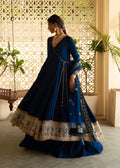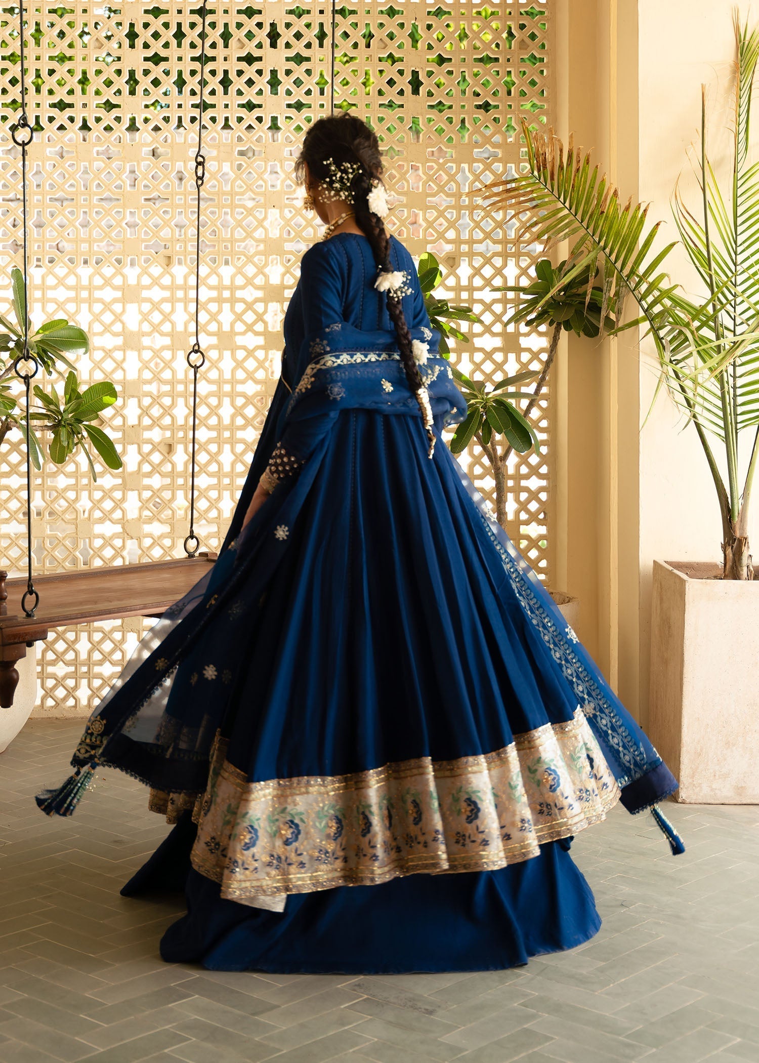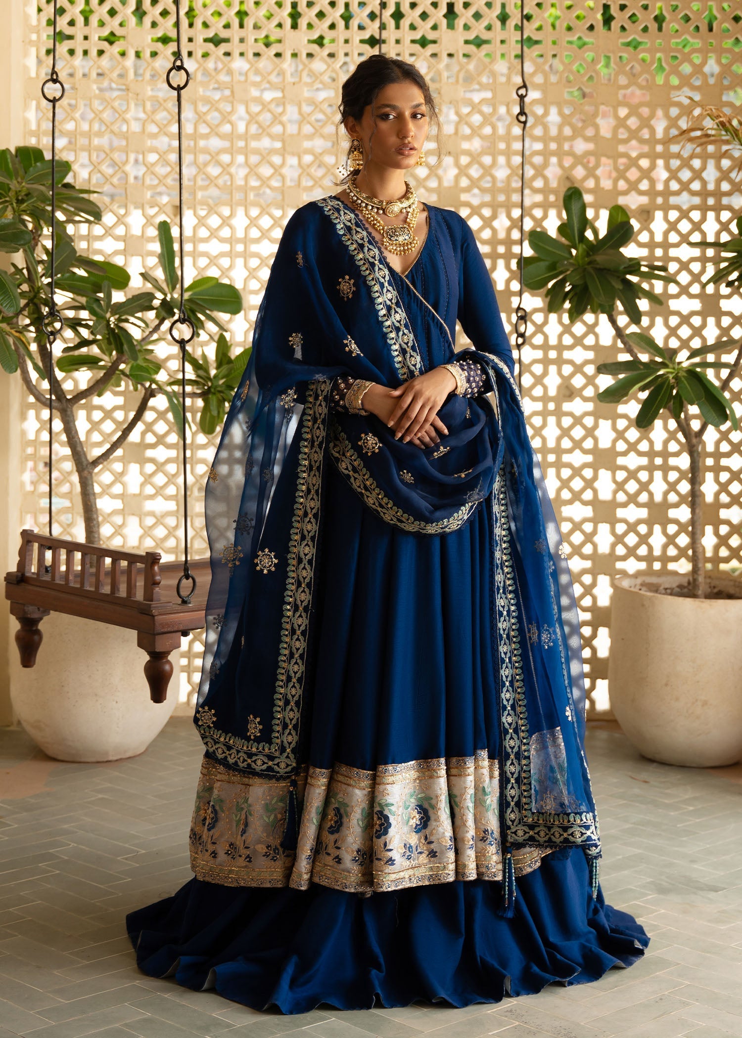 Royal blue classic peshwas sown painstakingly with fine jaali lace inserts and finished with a heavy embroidered floral border thatss enhanced with gold sequin work. The peshwas is paired with a sharara and an embroidered organza dupatta to complete the look.