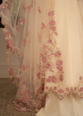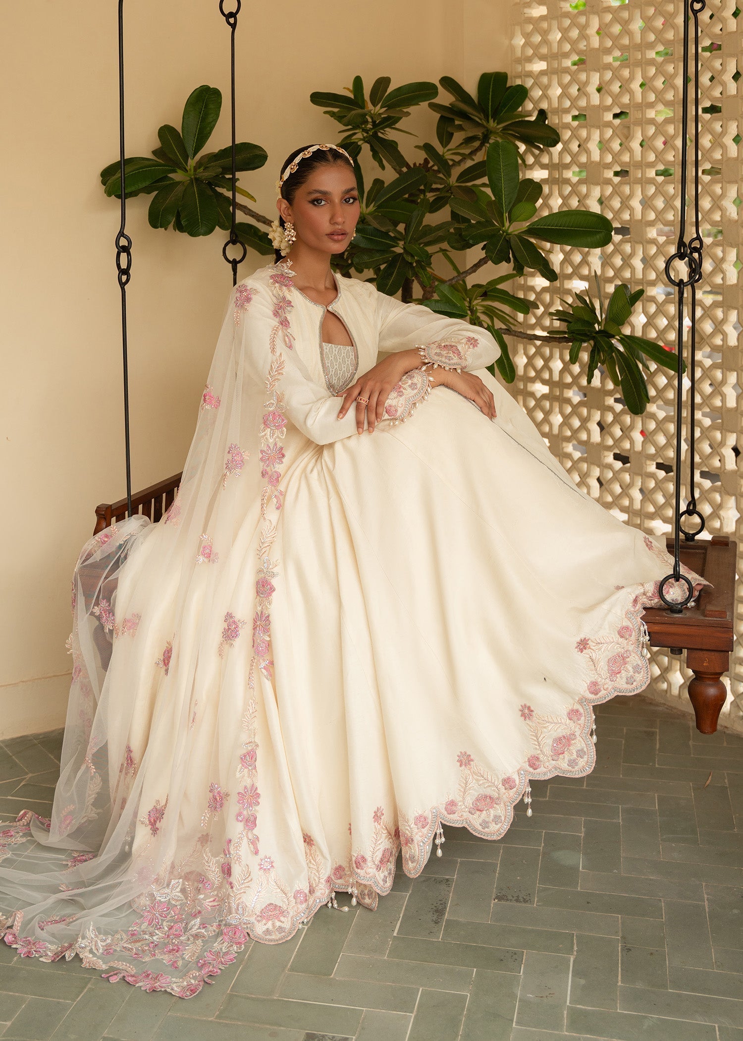 An ivory peshwas is a perfect offer for a classy tradition loving fashion connoisseur. Detailed in scallops featuring gorgeous pink florets studded with silver sequin and Pearl ornamentation, you can twirl endless in this light weight formal. The peshwas is paired with a two legged sharara and a gorgeous net Embroidered dupatta.