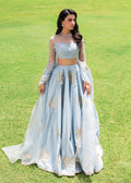 Ice blue choli fully hand embellished with swaroskis and gota. Paired with block printed hand crafted lehanga and organza duppata.