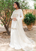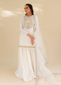 An exquisite white shiry gharara with embellished neckline and handcrafted border. It comes with an organza block printed dupatta.