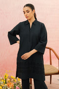 A Sleek Black Co-Ord Set Featuring A Shirt-Collar With A Straight-Cut Silhouette And Fabric Manipulation Along The Front, Paired With Straight Culottes.