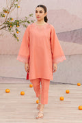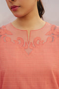 Melon Mist, A Peach Co-Ord Set With Floral Embroidery And Organza Applique Detailing. Paired With Straight Trousers.